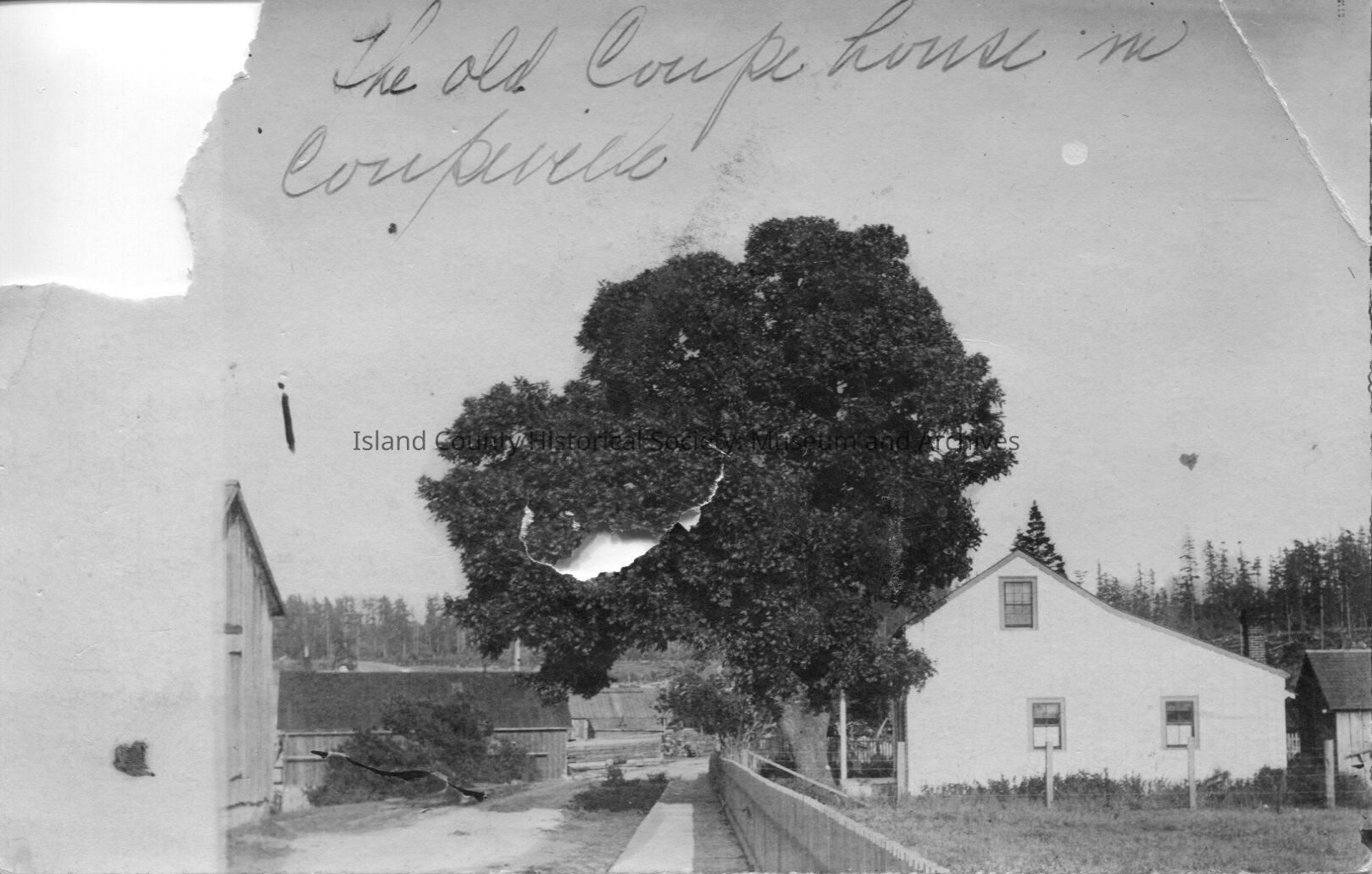 A postcard of a house and a large tree on it's left. Handwritten on the front is "The old Coupe house in Coupeville."