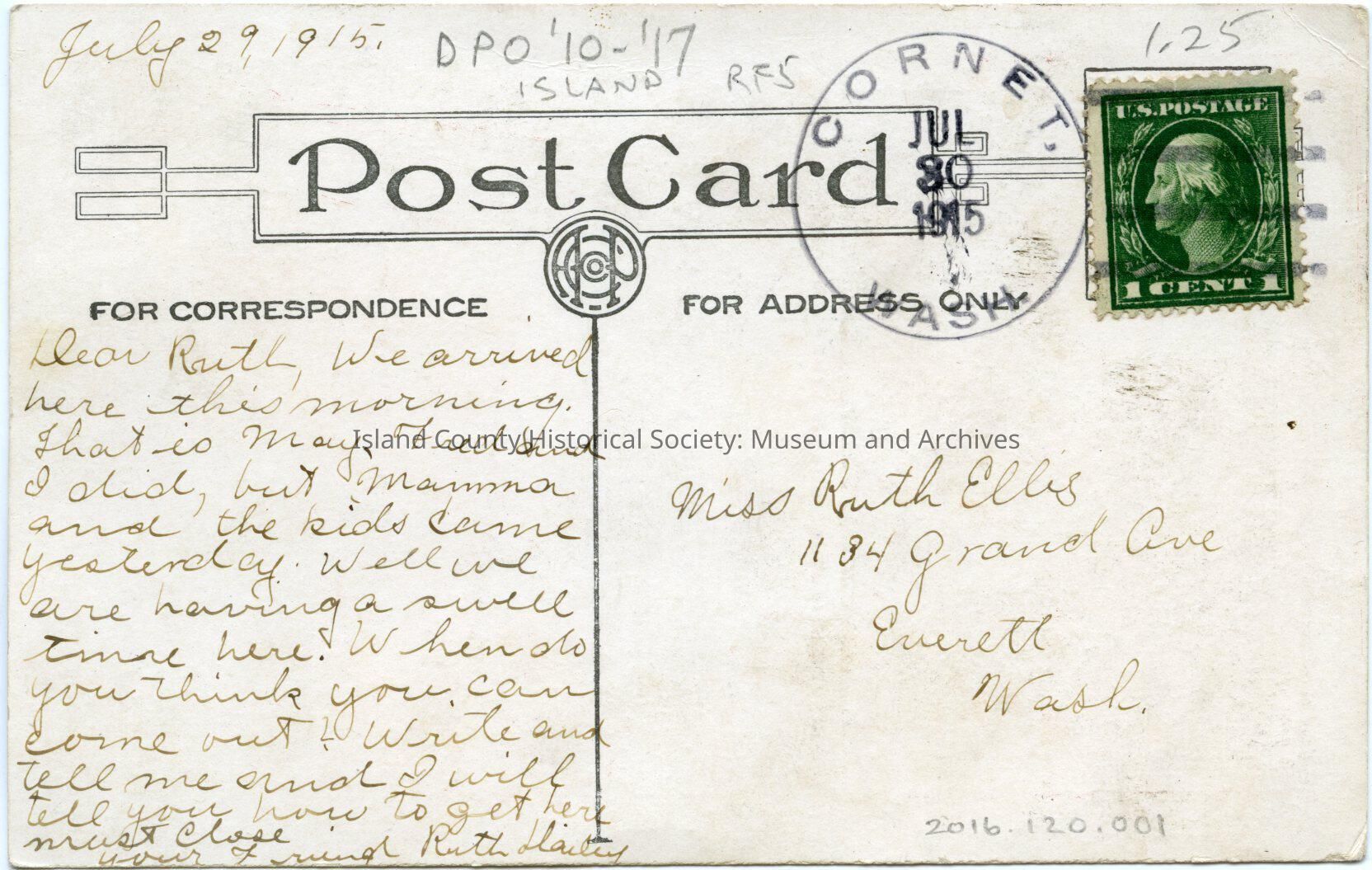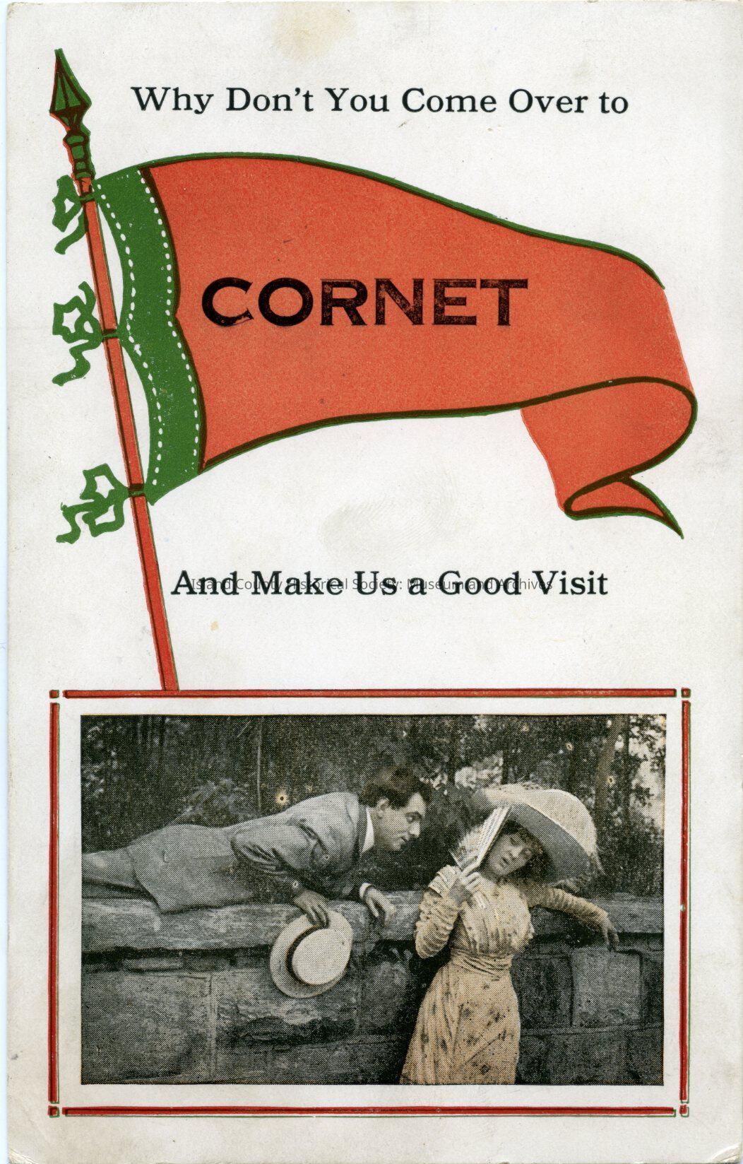 "Cornet" postcard- of Cornet Bay, used postcard stamped "Cornet Wash" "Jul 30 1915" 1 cent green US postage stamp, addressed to Ruth Ellis, from Ruth Hailey. Hailey tells of "having a swell time" and asking Ruth to come. The front has a red and green pole and flag. Middle of flag is "cornet", slogan "Why Don't You Come Over to [Cornet] And Make Us A Good Visit". Below the flag and slogan is border of red and within this border is a picture (tinted, black and white) of a man leaning across a stone wall clutching a hat and staring at a lady opposite. The lady is in a red dress and large white hat and holding (shielding her face) a fan as she leans along the wall. Trees in background wooing scene.Made/Created