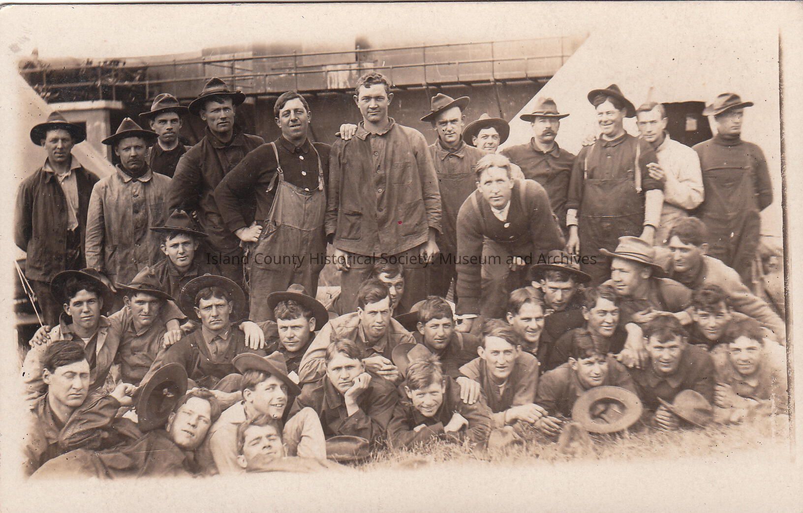 Large group of soldiers standing, lying down in front, some wearing hats. They are in front of the gun battery. Some are in uniform, others in work clothes. A few soldiers are "hamming" for the camera. At Fort Casey.