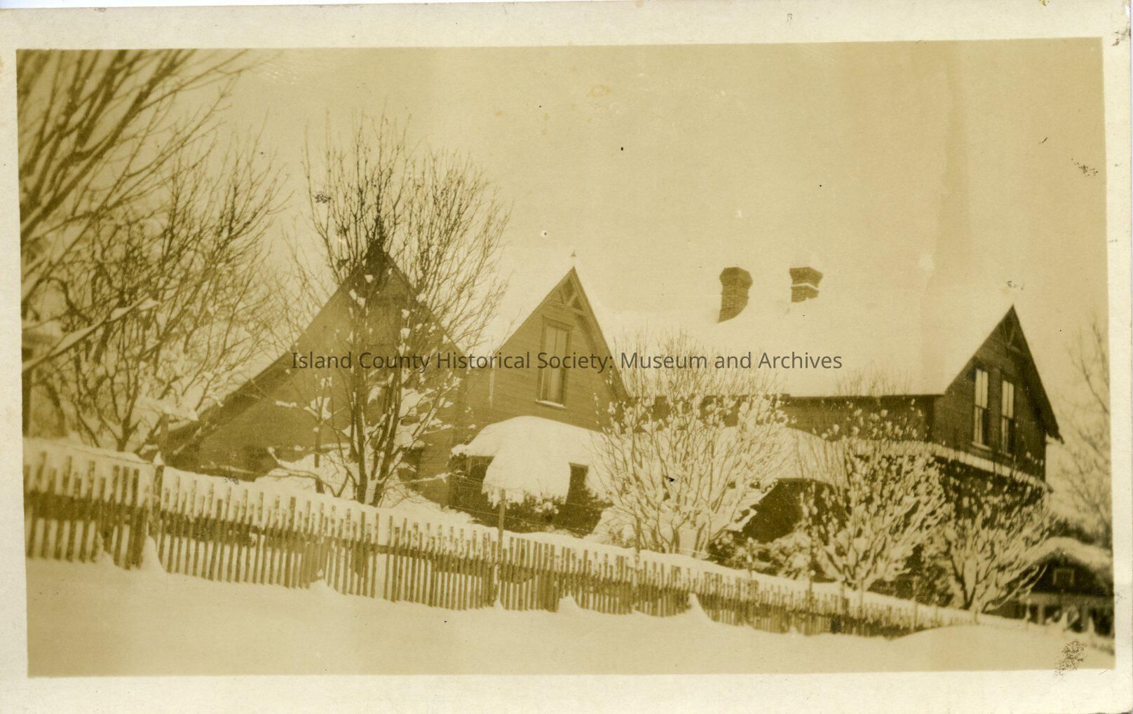Black and white postcard snow on two buildings, with peaked roofs, chimneys, trees, shrubs and picket fence. Probably at least a foot of snow. On the back: Snowy winter. Byrne house.