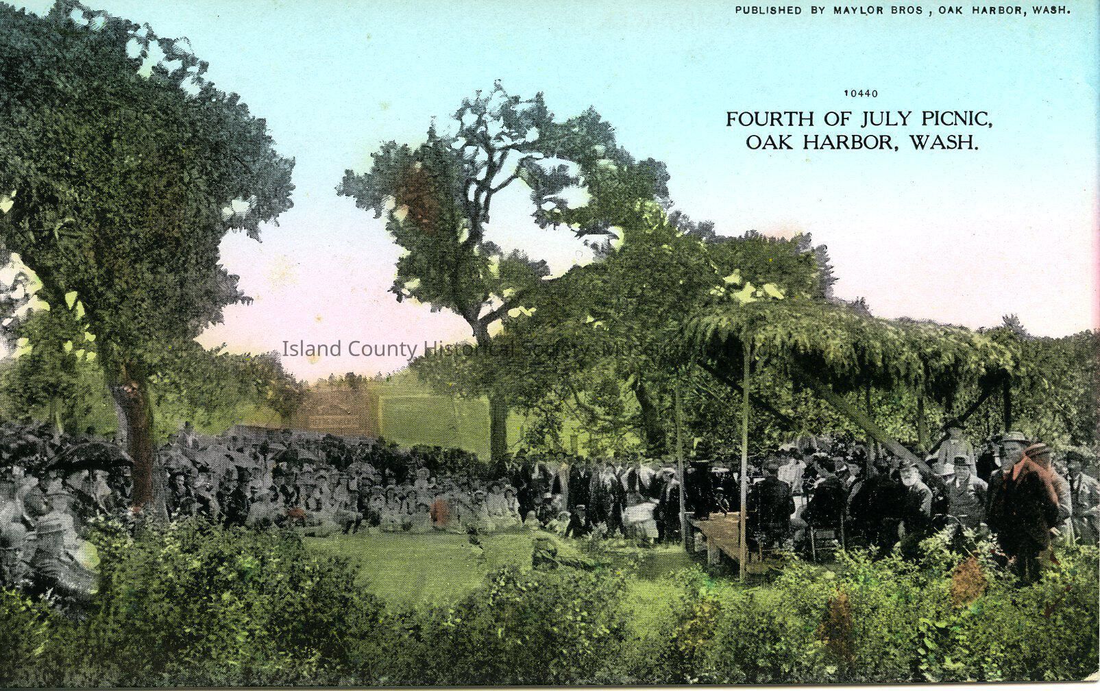 Postcard with photo of gathering in Oak Harbor. Most likely colorized photograph; people are in black in white, while plants/trees are colored. On front of card: "Published by Maylor Bros, Oak Harbor, Wash. 10440 FOURTH OF JULY PICNIC, OAK HARBOR, WASH." Postal rates on back: domestic one cent, foreign two cents (no later than 1952, probably much earlier).Made/Created