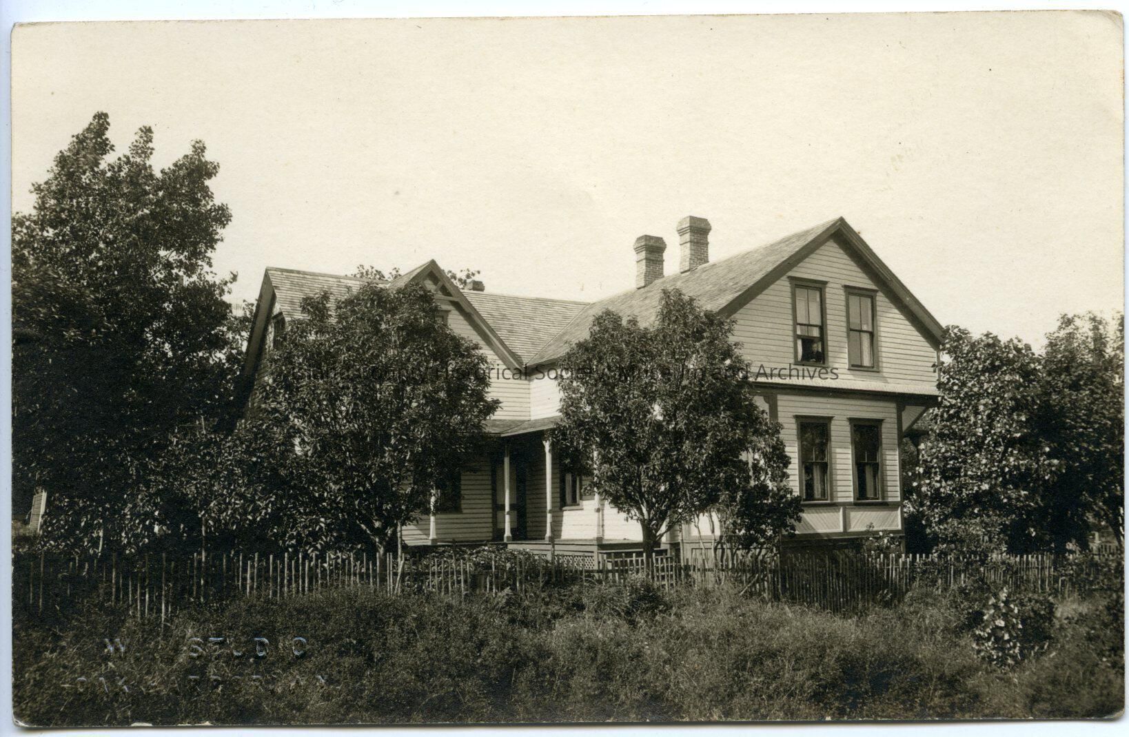 Black and white photo of the L.P. Byrne House located in Oak Harbor, WA. Two brick chimneys. Picket fence. A number of trees surround the house and partially block the side view and gables. Written on the back: Mrs. I. Granier 502 Bel.