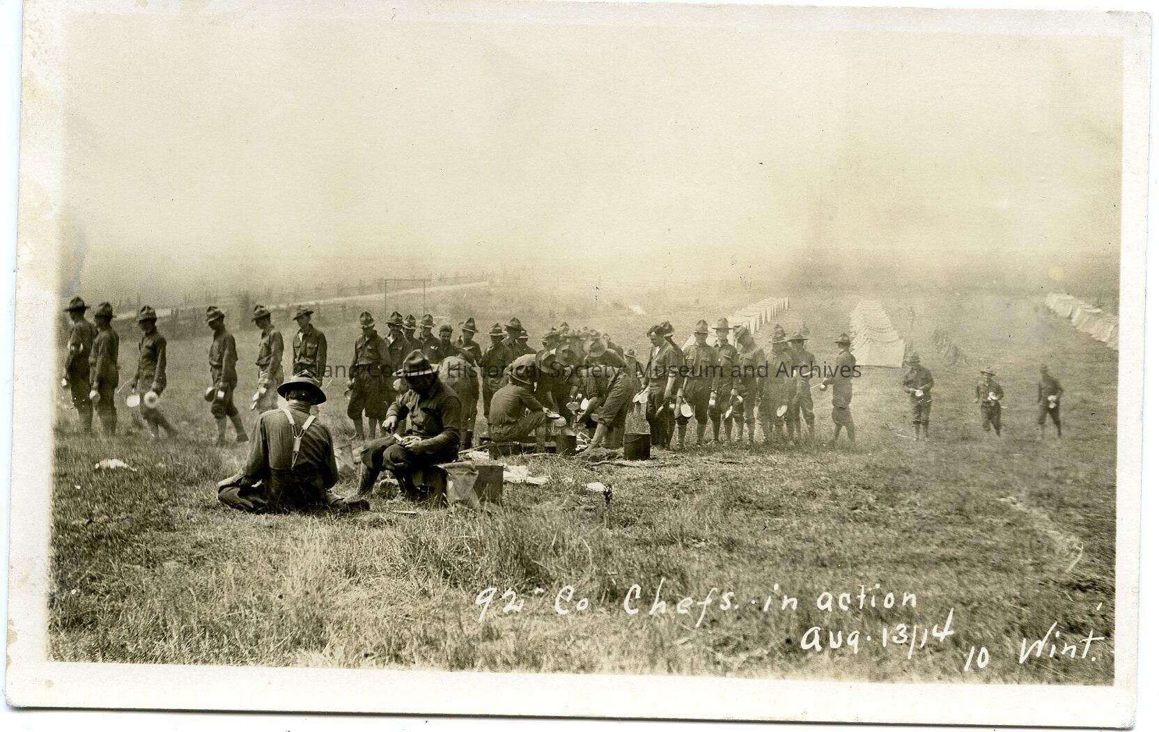 Black and white (sepia) postcard image of soldiers in a field with tents, taken August 13/14. Written on the back: "Ft. Casey". Written on the front: 92 Co. Chiefs in action. Aug 13.14