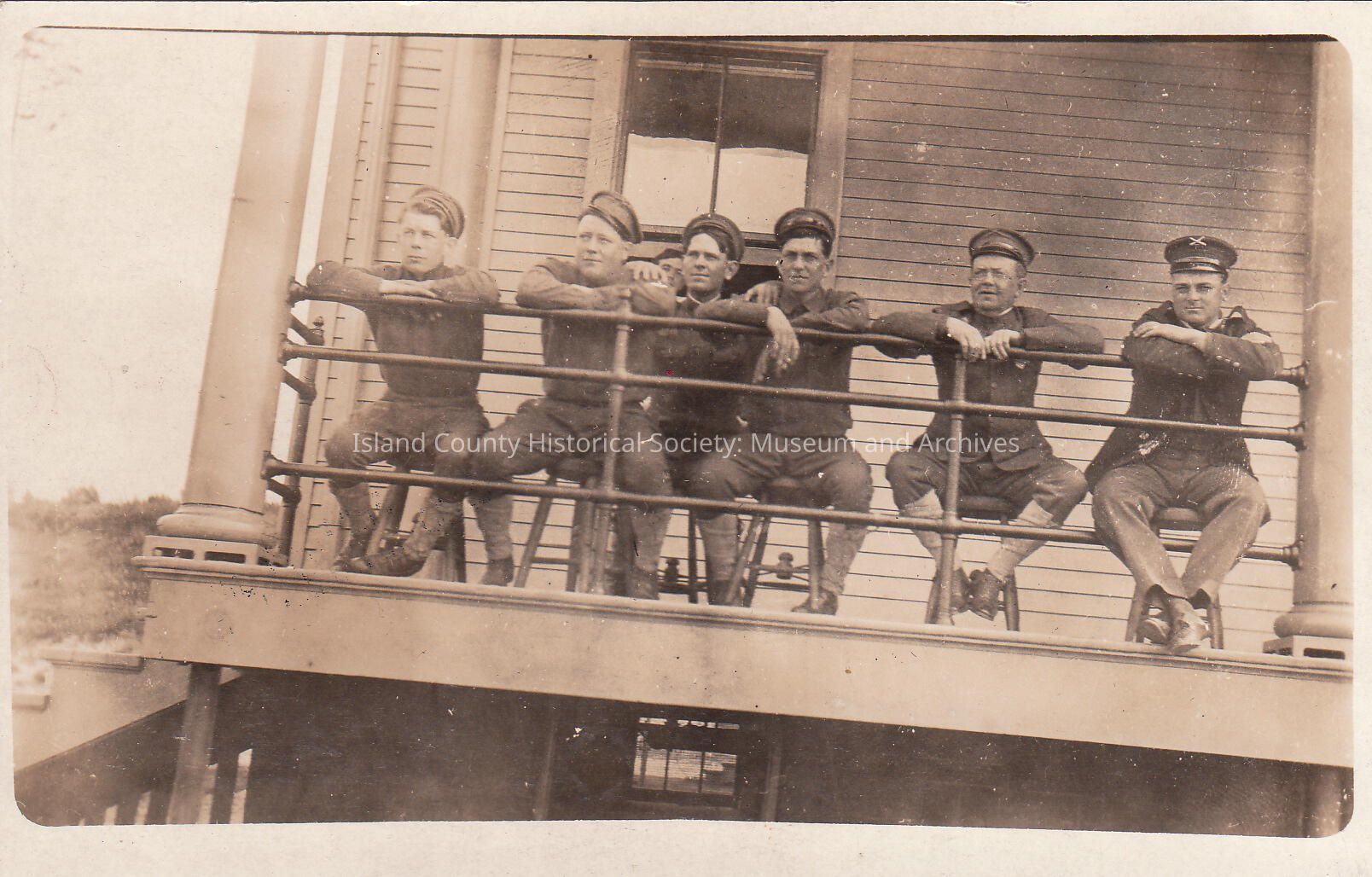 Six soldiers sitting on a porch and one standing behind them in the window. Porch has metal railings and columns on each side. Soldiers of Ft. Casey.