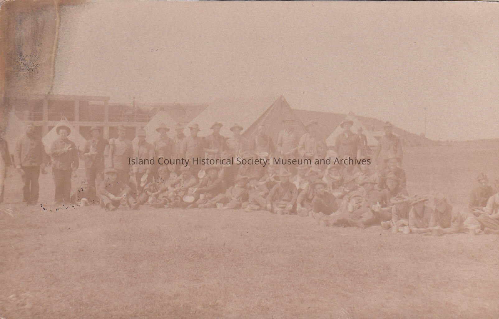 Group with Mess Kits infront of tents, Ft Casey. Soldiers sitting on the ground with others standing behind them - two rows. A building and tents as well as the gun battery are behind them.