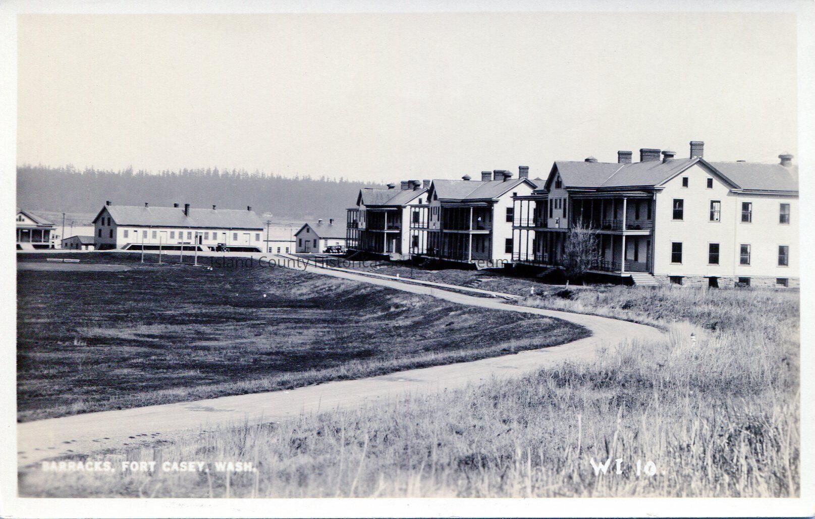 Photo post card: Fort Casey barracks prior to WWI. Note 'Fort Casey' has not been painted on the roof of the Quartermaster building. Camera facing east direction slightly south.