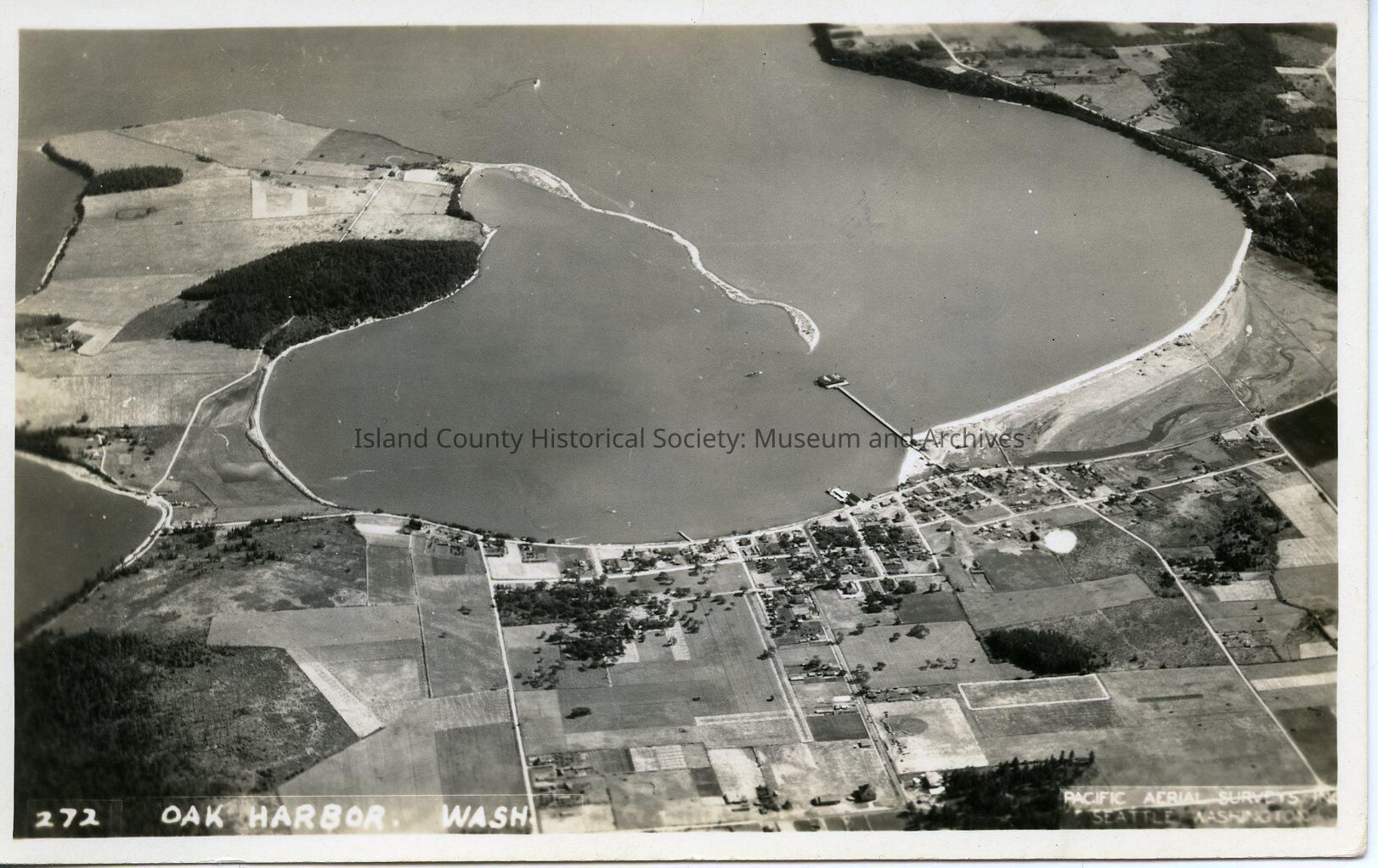 The black and white photo is an aerial view of Oak Harbor. The water shows a boat that is heading over to a loading dock. The view shows various roads and trees as well as a few farms.