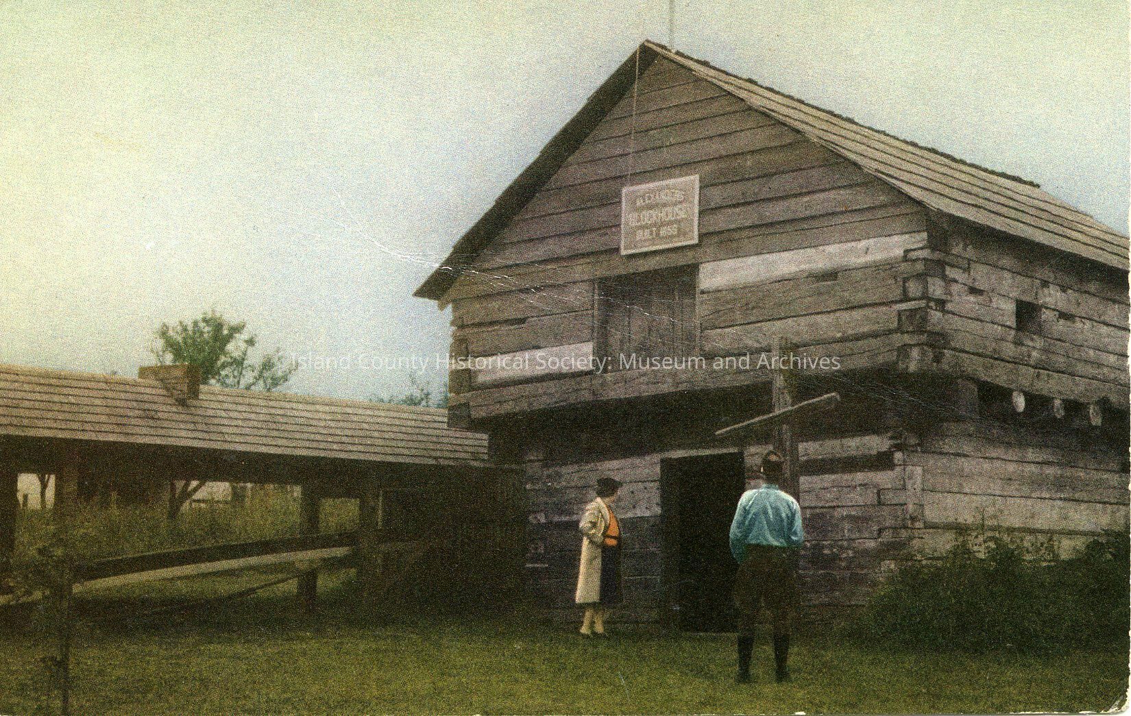 The color photograph shows two people looking at Alexanders Blockhouse. Next to the blockhouse is a largeboat and a large tree behind that.Made/Created