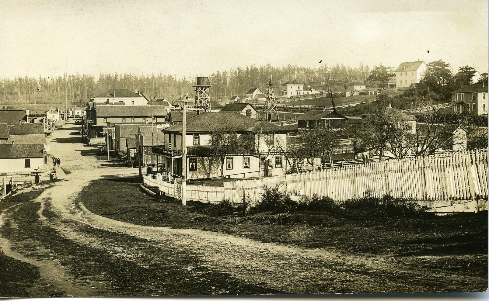Black and white postcard of Front Street, Coupeville. Postcard taken from the path to the current town park looking down Front Street. Two towers are in tthe picture and one looks like a water tower. AZO postcard issued 1911.