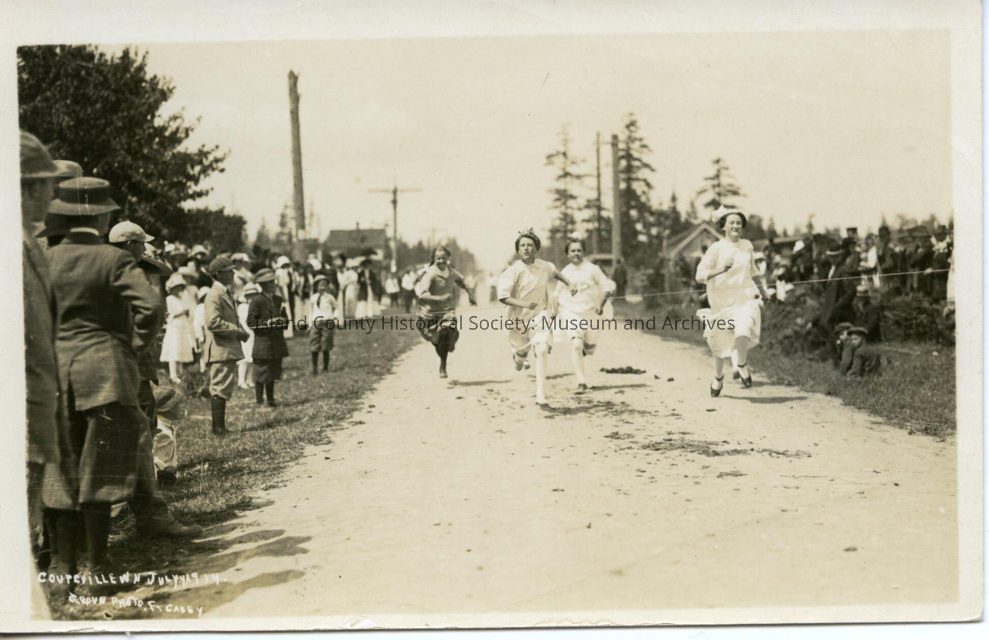 Photograph of men, women and children watching a foot race of 4-5 young women. The lettering on the lower left side says Coupeville WN July 4 1914 Grove Photo, Ft. Casey. It is a postcard. Written on the back is: Eunice Parker on right. They are probably at the finish line.