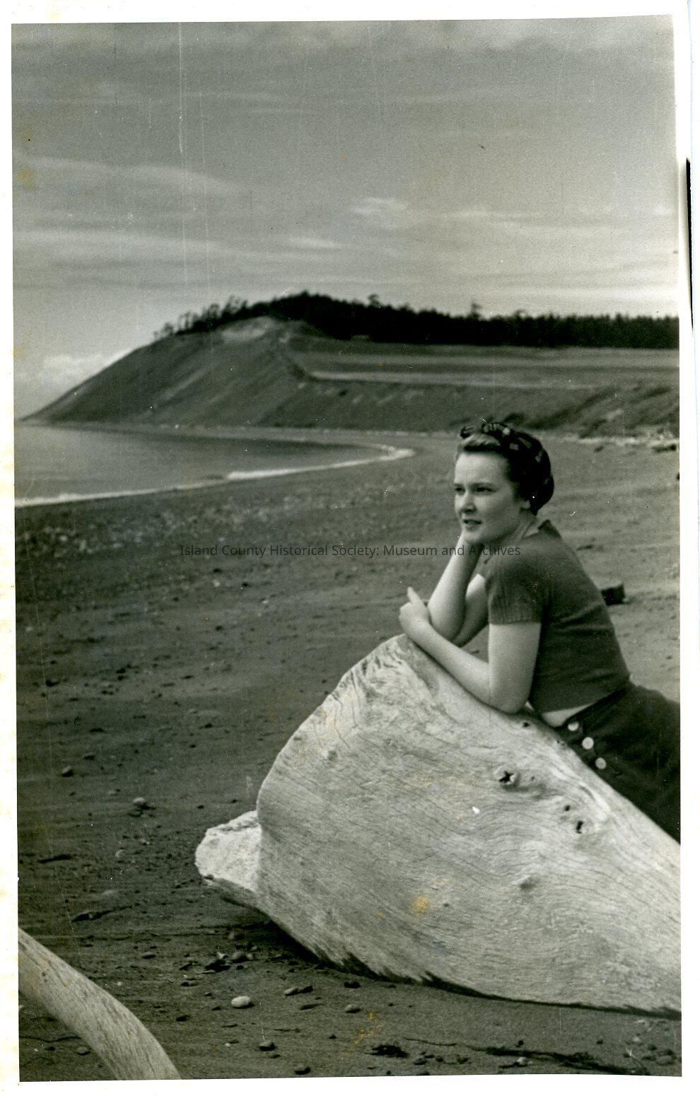 Postcard of a woman reclining on a large piece of driftwood on Ebey's Landing with the Ebey's Bluff behind her. She is wearing a bandana, short sweater and trousers or skirt with side buttons. The postcard is address to Maggie - Miss Marjorie Vane, the donor's mother who lived in Coupeville. It is postmarked May 16, 1941. There is a stamp in green ink on the back: Grove Photos Coupeville.