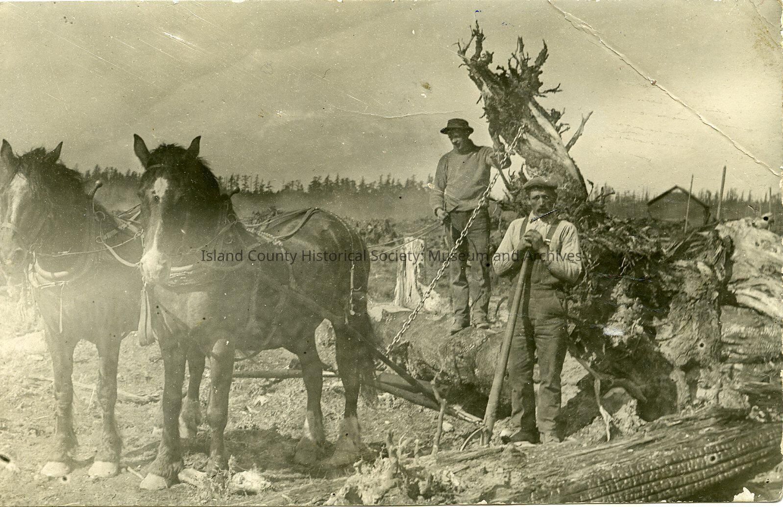 Black & white postcard photo of the Fabers clearing land. The picture shows two men with a team of two horses chained to a large tree stump. They are clearing stumps from a large tract of land. One man is in overalls, suspenders, and a cap. He is holding a long-handled tool in his hands. The other man is in long pants, a sweater, and a brimmed hat. The side of a cabin/barn is in the distance on the right side.