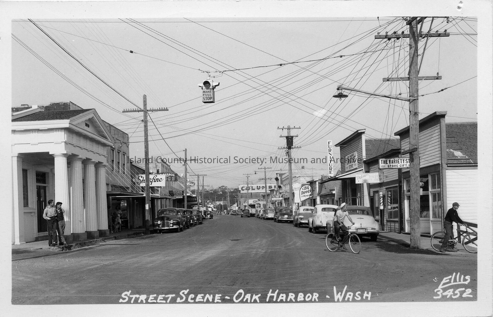 This postcard shows the intersection of what is now Pioneer Way and Dock Street. However at the time of the photo, the streets were likely named Main Street or Barrington Street and Bank Street, respectievly. There are a number of power lines all over the street and at the intersection there is a stop light that reads, "Make Full Stop." The bank can be seen on the left with four large columns. Other stores visible are the Variety Store, a furniture store, Big Dipper Lunches, Fredericks Cafe, Columbia, Sh_rfine, Oak Harbor Drugs, etc. Two men are leaning against the first column on the bank and two men are biking through the intersection. Written on the phot is "Street Scene- Oak Harbor- Wash Ellis 3452."Made/Created