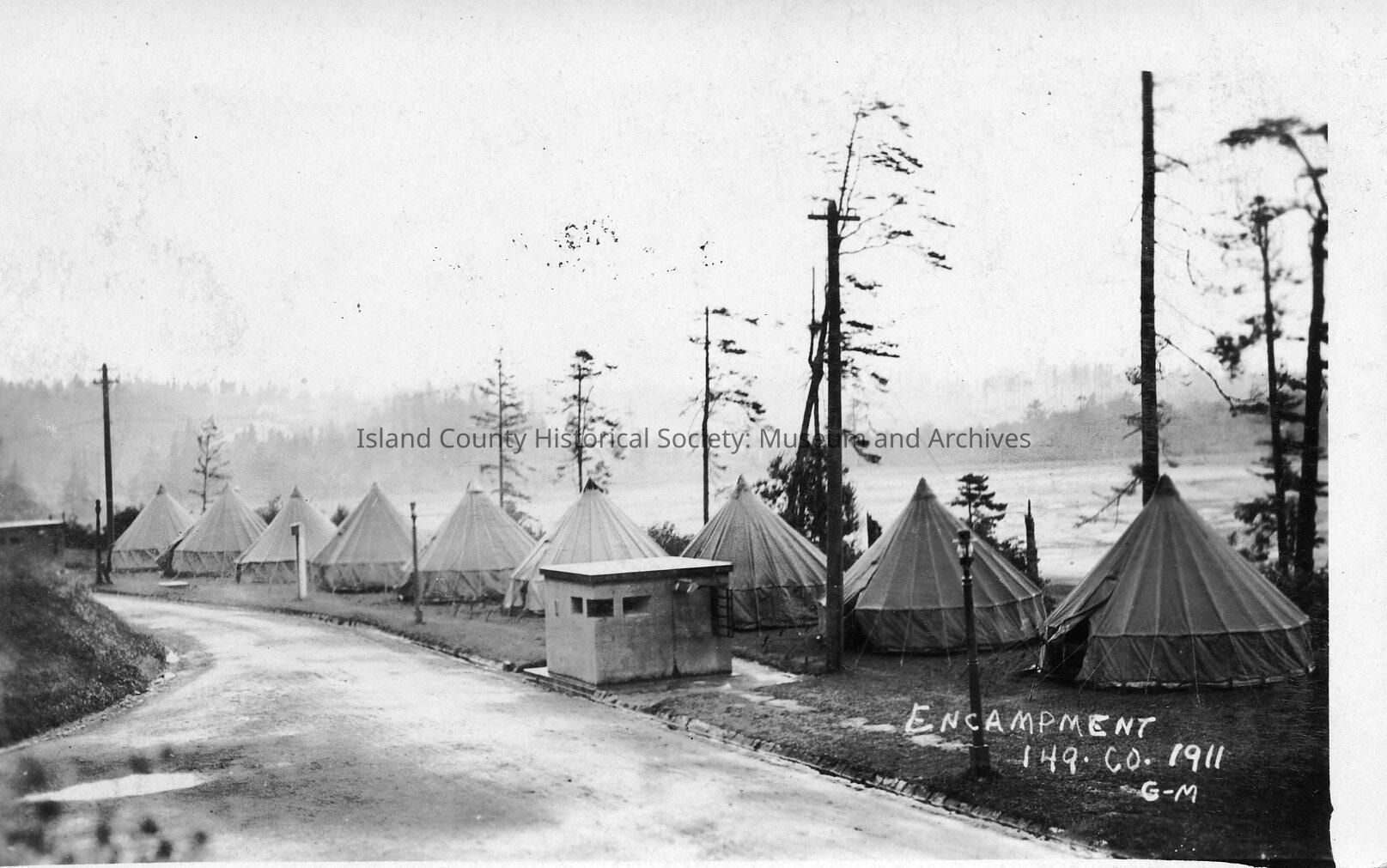 Morter Batteies Battery Parade road. Camera facing north y north east. Image taken on the steps between BAttery Schenck and Battery Seymour. Summer encampment 1911. Two data/telephone booths. Mortar aiming data received from the plotting room then written on boards and pushed out on the near side. The crews would look at the boards and know what zone and azimuth/elevation angles are needed to load and aim the mortars. Notice the kerosene lamp posts. Also the plotting rooms were in the fire control building adjacent to the lighthouse. The plotting room foundations currently seen today were from the new plotting rooms constructed in 1915. SJK