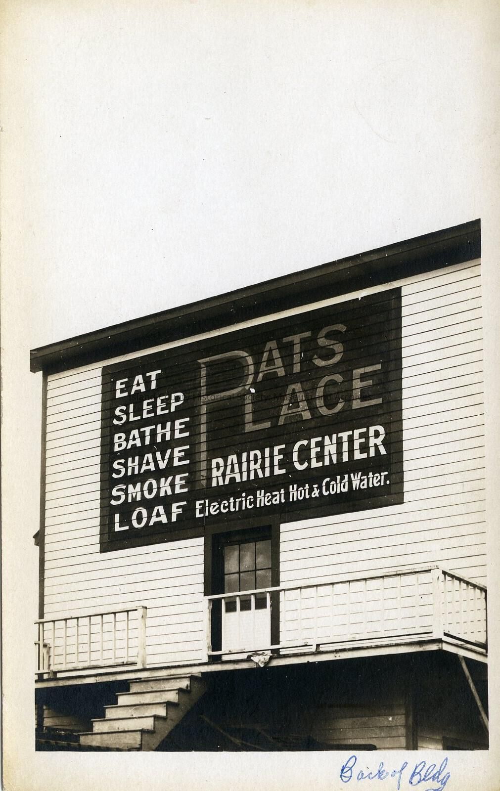 Black and white photo shows storefront of Pats Place with four people on the balcony.