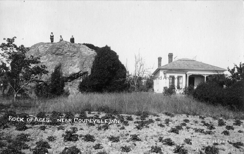 "Rock of Ages" in Coupeville Wa. The largest rock left by the glacier in Washinton State. The postcard shows a very large rock with an old white house next to the rock. The house was once owned by Dr GV Calhoun.