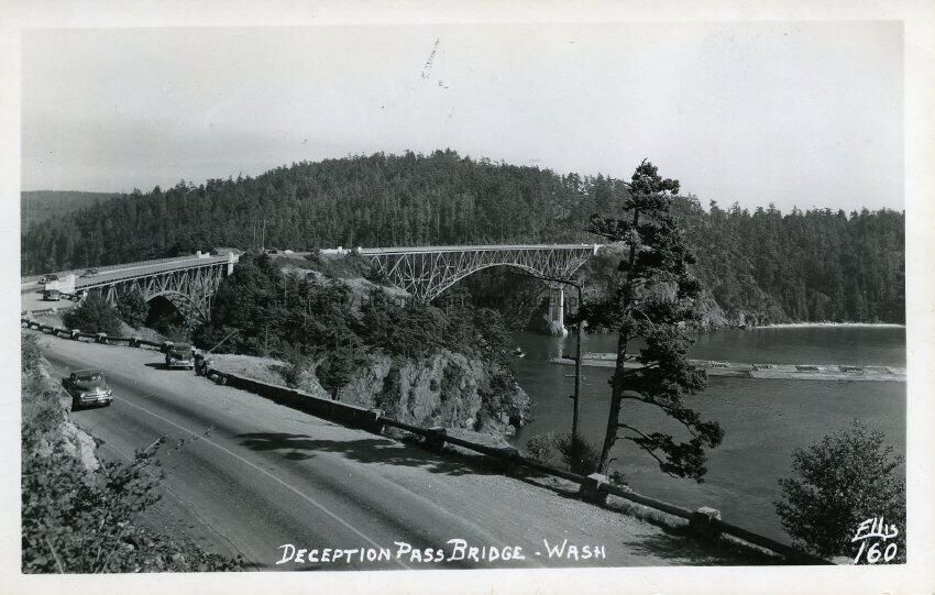 This black and white photo shows a view of canoe pass and deception pass. On the bridges are old cars. Next to the railing by the cars, the trees on the cliff have collapsed.