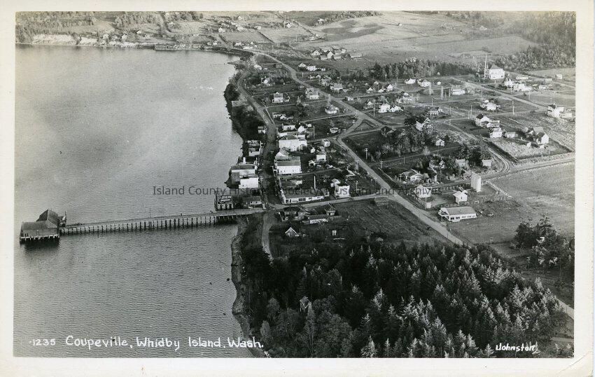 The black and white photo is an aerial view of Coupeville. The view shows various roads and trees as well as a few farms. View from above Stills Park looking east with the wharf on the left. The road is still visible in front/along the shore of Captain Coupe's housePhotograph Details