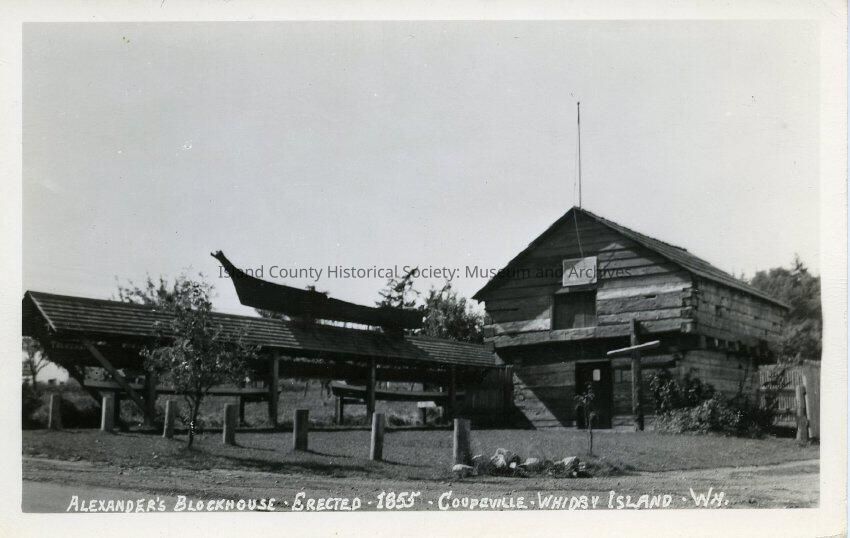 The black and white photo shows a view of Alexander's Blockhouse and a large cross, next to the cross is a large boat. Snakelum's canoe is on top of the boat shelter.