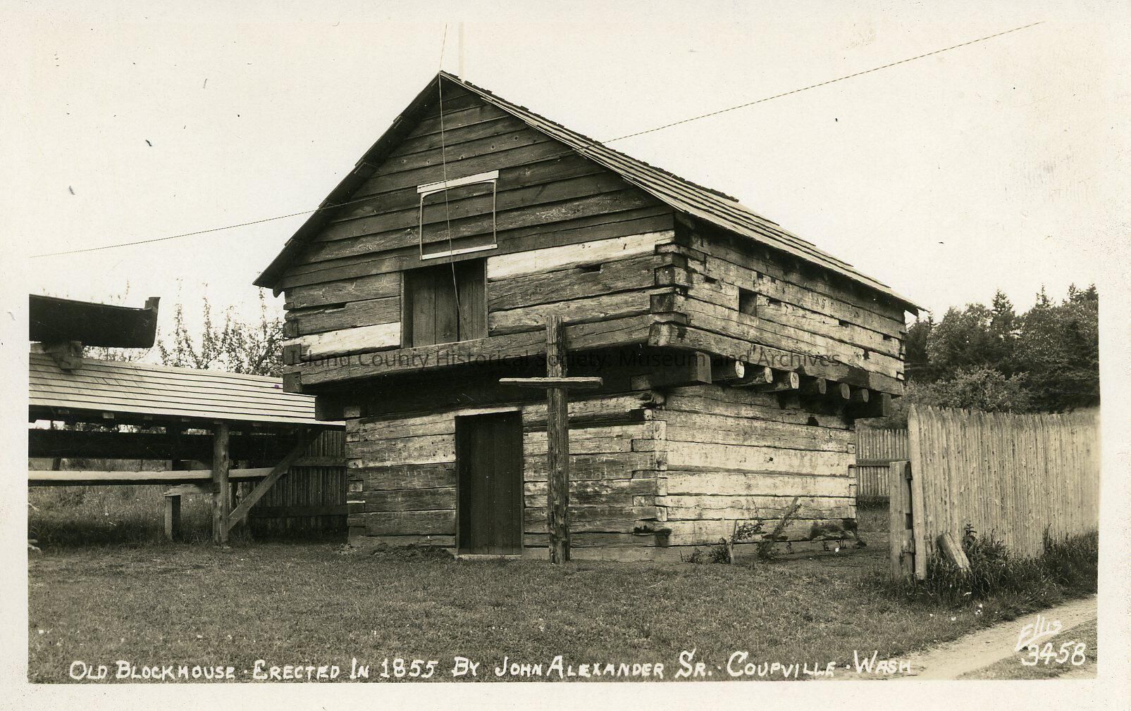 The black and white photo shows an old blockhouse created in 1855 by John Alexander Sr. The blockhouse is located in Coupeville, WA, there is a large boat next to the blockhouse as well as several trees. Chief Snakelum's canoe is on top of the boat house.