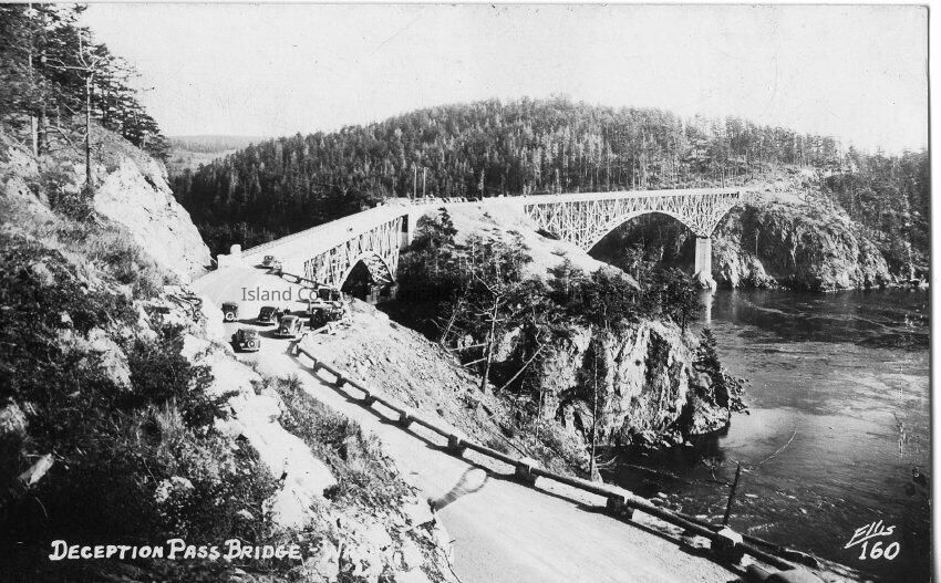 Black and white postcard of Deception Pass Bridge. Several cars can be seen approaching the bridge. Judging by the style of cars in this photo it is likely from around the 1930's.Made/Created
