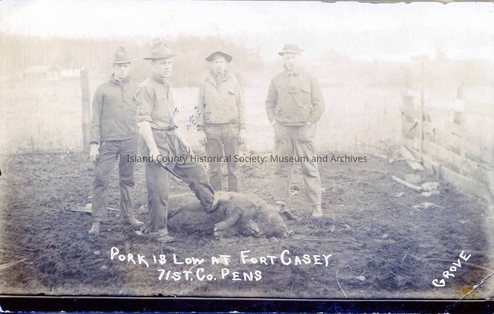Postcard: "Pork is low at Fort Casey 71st. Co. Pens" Four men standing over a dead pig.