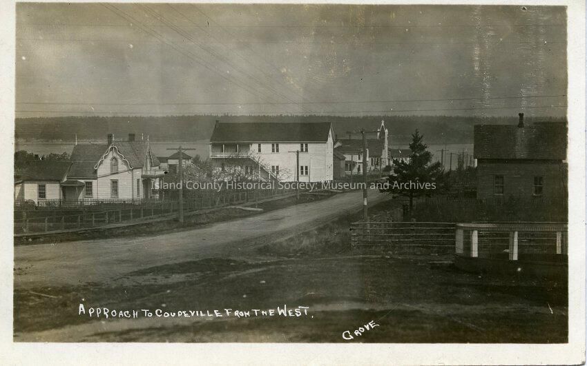 A black and white view of Coupeville from the west.
