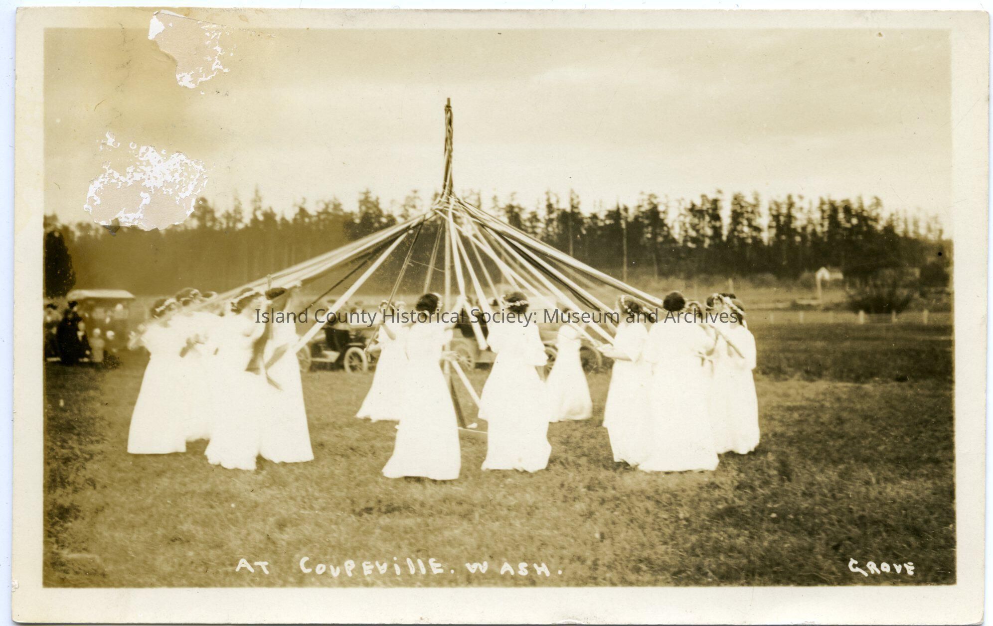 Photograph of young women winding the ribbons on a may pole. The young women are in probably white long dresss with flounces, sashes and have flower circlets in their hair. There are a few cars in the background. Across the bottom is written At Coupeville, Wash. Grove.