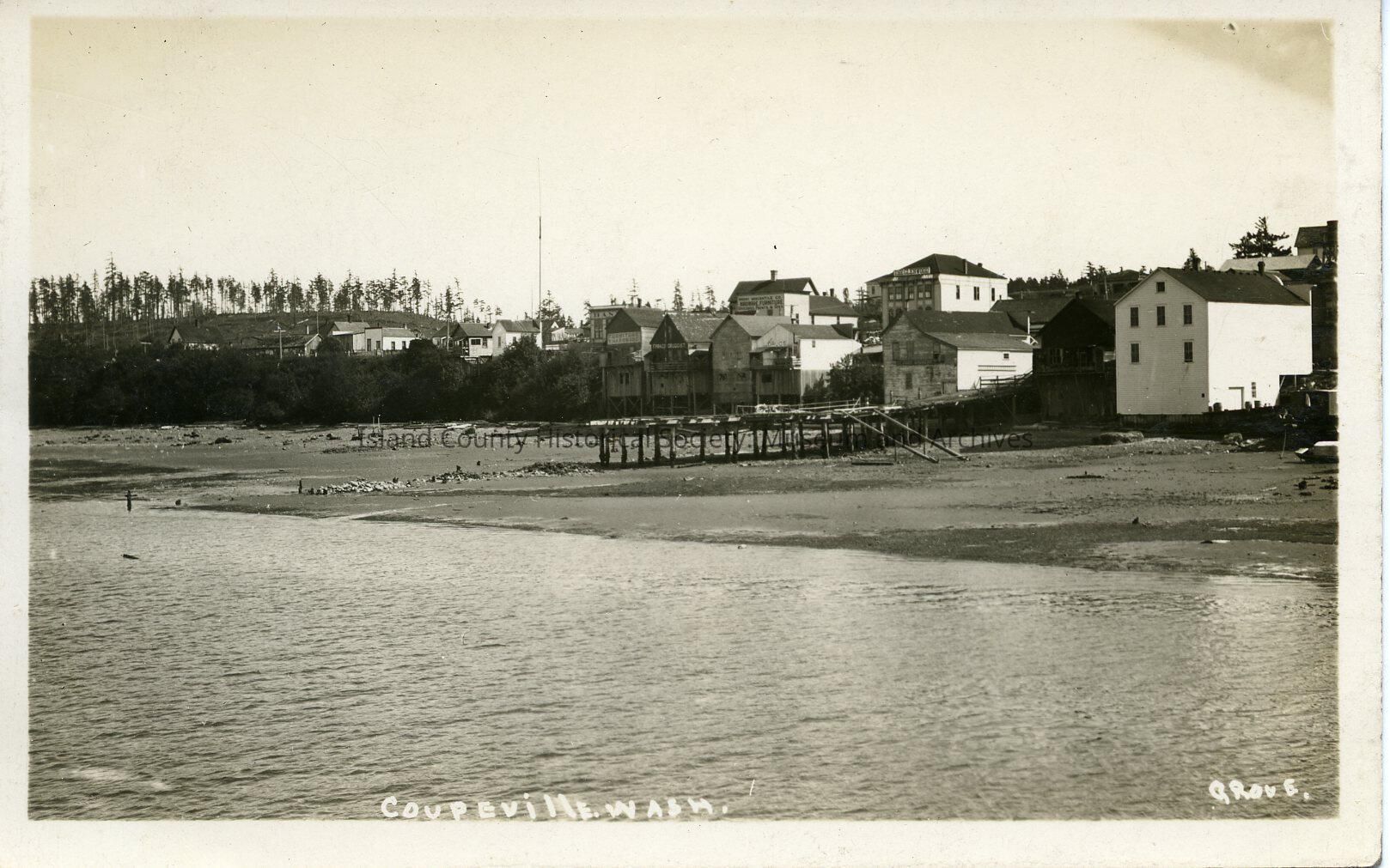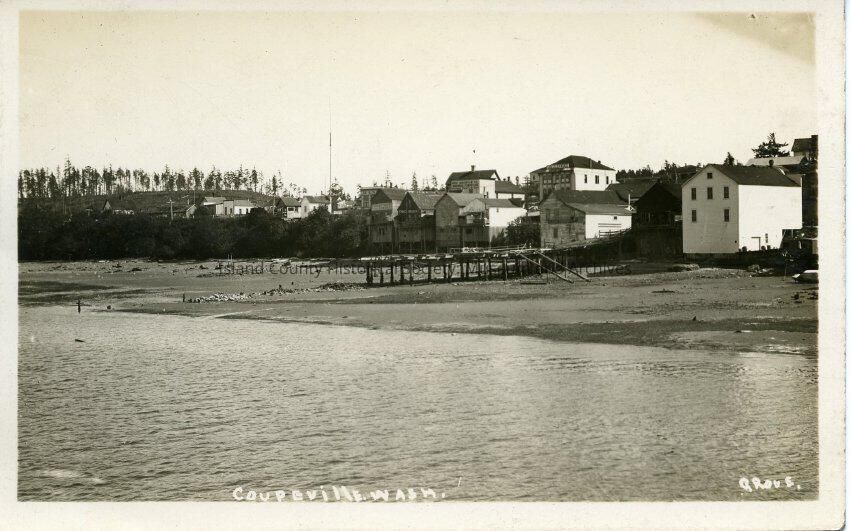 Black and white photo shows white houses and pier extending from between two houses. Coupeville