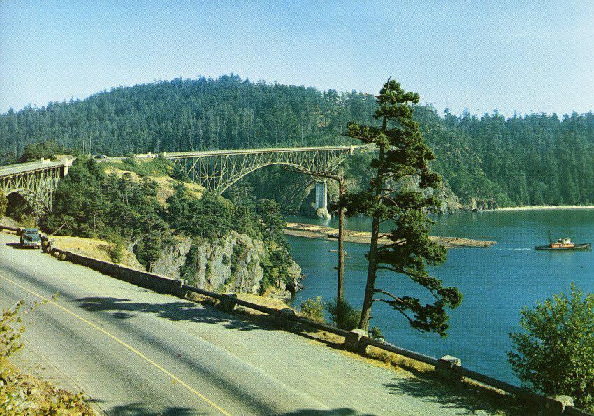 This photo shows a view of canoe pass and deception pass. On the bridges are old cars. In the water there is a boat passing by towing logs.