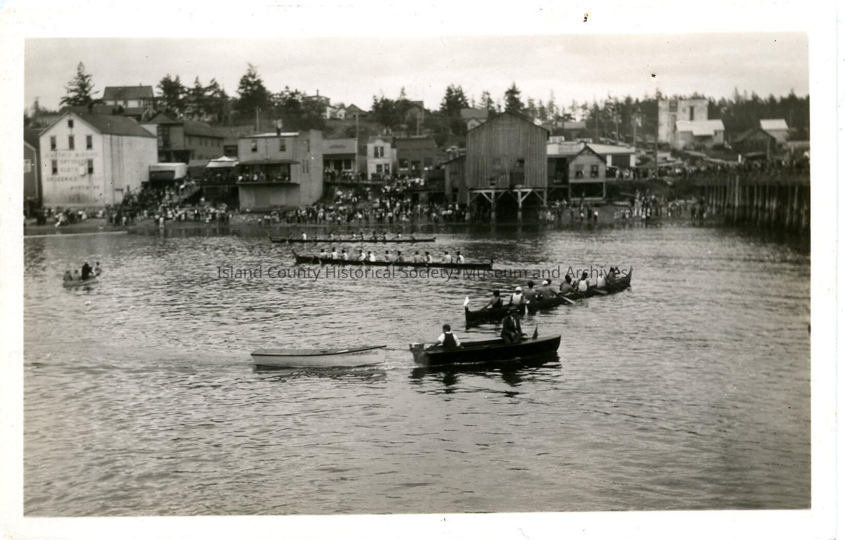 Native American canoes and paddlers at the Coupeville Water Festival. At least 3 canoes, with 11 men each, are in the water near the Coupeville wharf. There are other boats alongside the canoes. Buildings on Front Street: GIllespie Livery, Kingfisher, and what is now Mosquito Fleet.