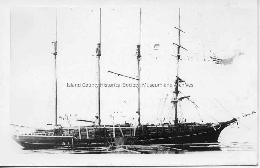 A four masted ship upon which logs are being loaded. There are a number of rafts of logs floating in the water in the foreground. Two men can be seen standing on a dock near the stern of the boat. The boat takes up the majority of the frame of the photo.