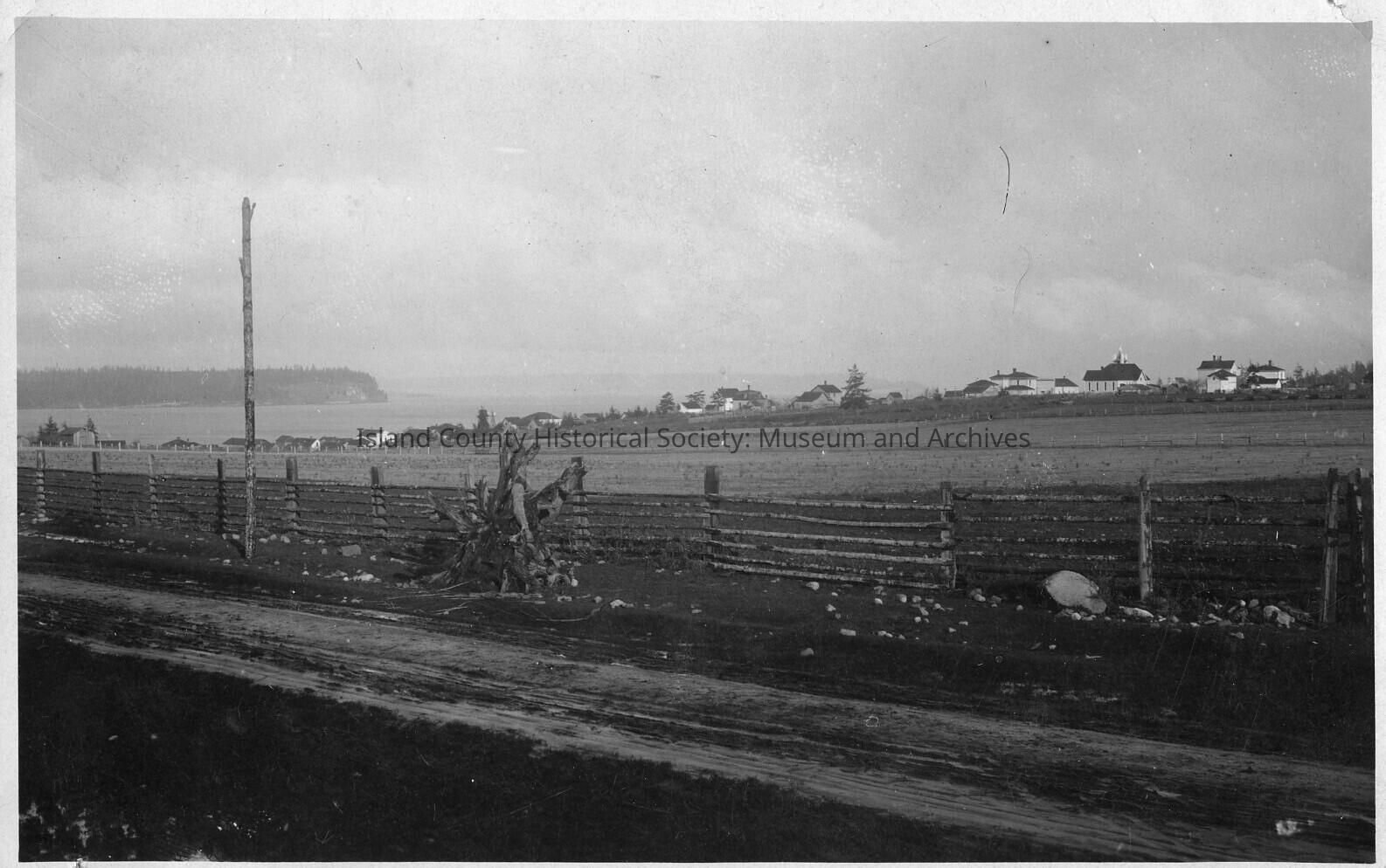 Black and white postcard of Oak Harbor. Photo shows a spit of land with homes, the photo is taken along a dirt road looking out across a span of water and the land on the other side. This postcard was printed between 1904-1918. Addressed to Miss Ada Herrett.Made/Created
