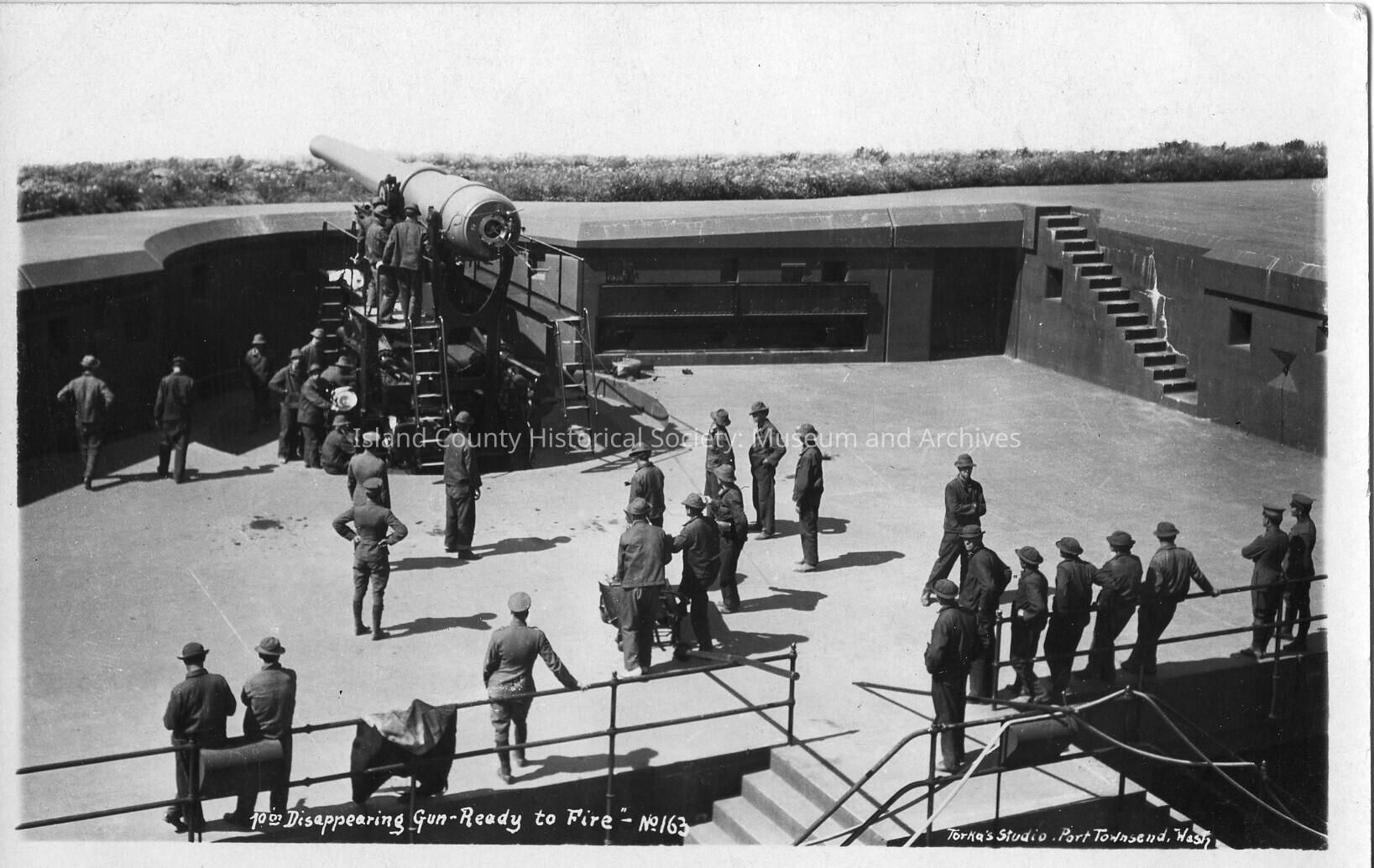 Black and white photo postcard showing Ft. Casey. Several soldiers stand around a large gun while it is being prepared to be fired. Bottom of photo reads: 10:00Disappearing Gun-Ready to Fire-No. 163