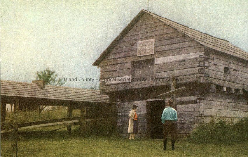 Color postcard of a man and woman outside the historic blockhouse, to the left the canoe shelter can be seen. These postcards were printed for Union Oil Company's "Natural Color Scenes of the West" series; this is No. 13. Part of the postcard on the back: "1890-1940 Our 50th year of service"Made/Created