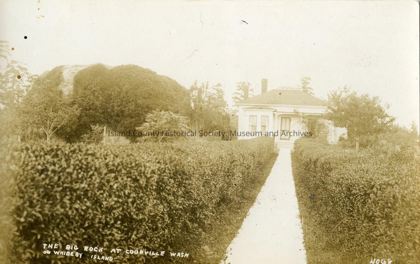 Front view of Dr GV Calhoun's house. To the left is "Big rock" or "Rock of Ages" the largest rock left by the glacier in Washington state.