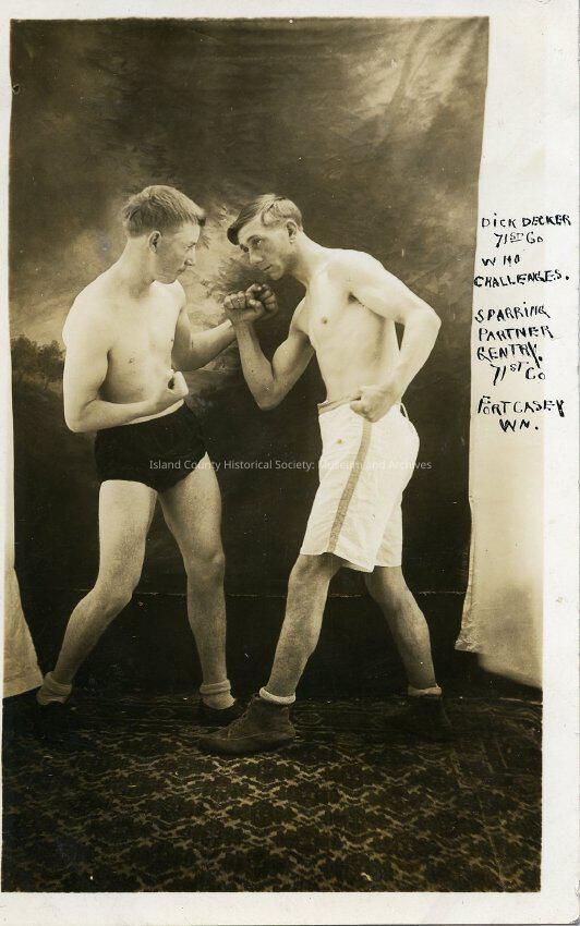 Postcard showing boxing team sparring partners, as read on the card: Dick Decker 71st Co. who challenges sparring partner Gentry 71st Co. Fort Casey, WN. The two men are posing as if they are in a sparring match.