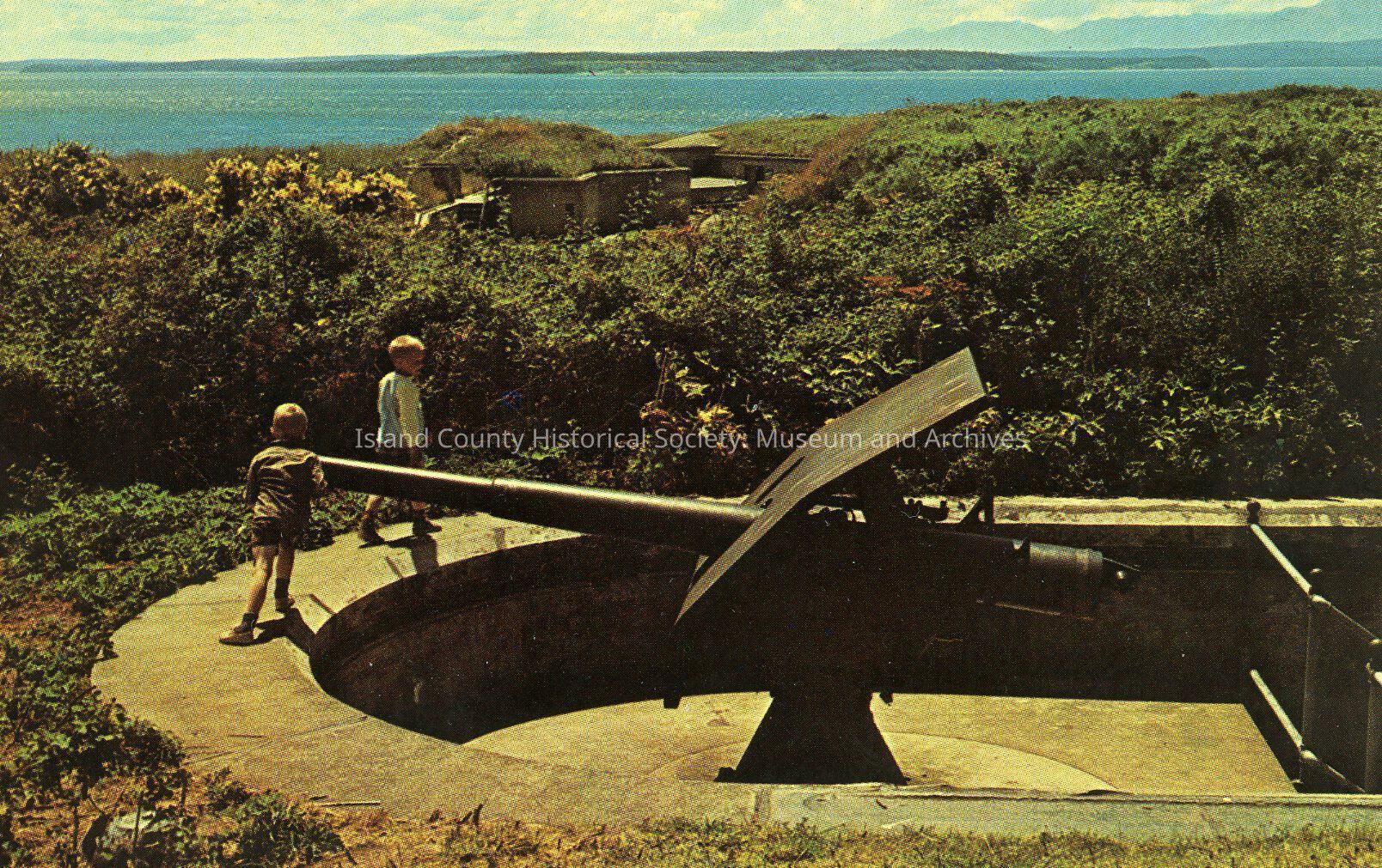 Color postcard of Fort Casey - two children looking at a gun.Made/Created