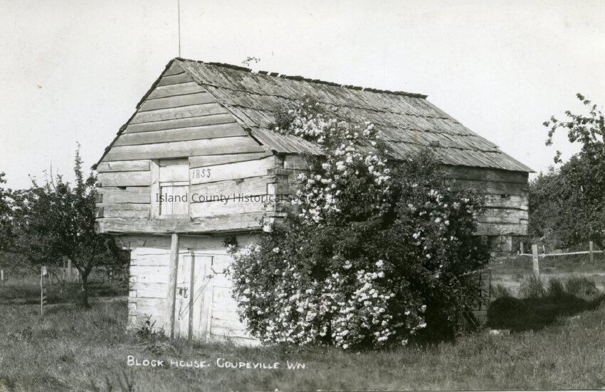 Blockhouse in Coupeville, WA with a large bush growing next to it climbing onto the roof.