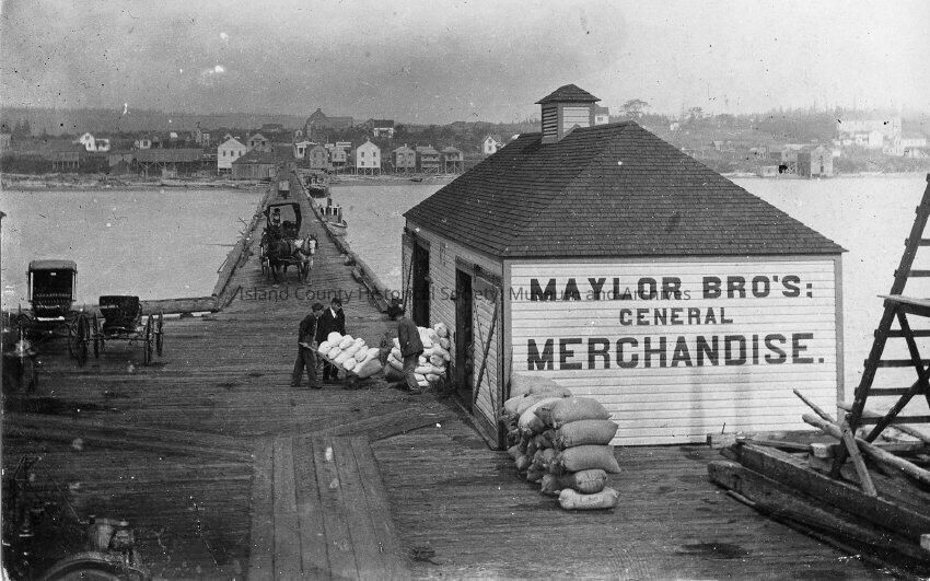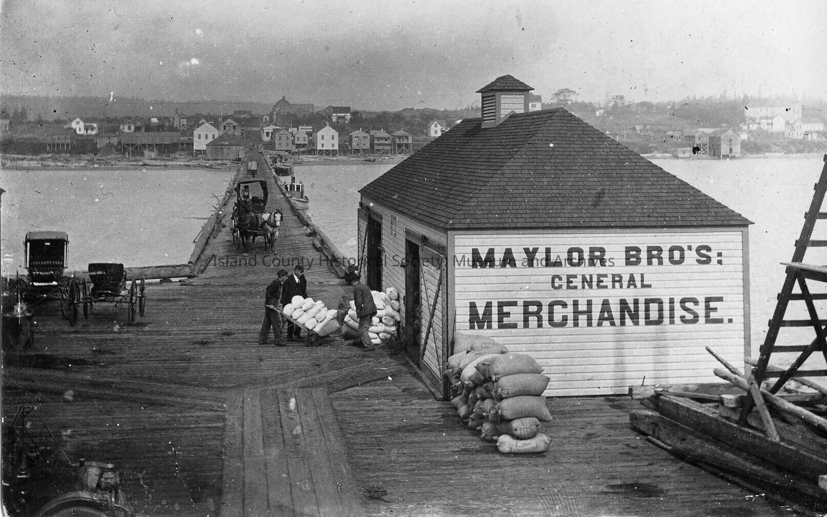 Maylor Bro's General Merchandise at the end of Maylor's dock. Three men are loading supplies into the merchandise building.