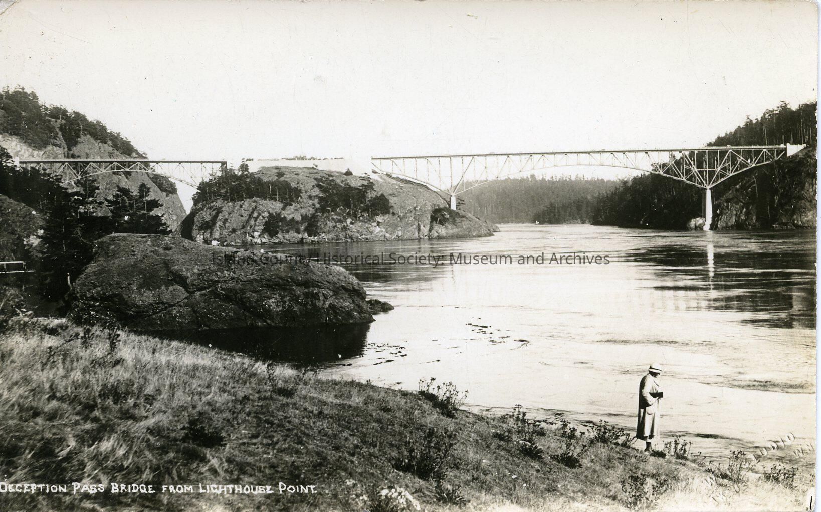 This black and white postcard from 1924-1949 shows the completed Canoe Pass and Deception Pass bridges. The bottom half of the postcard shows a person standing along the edge of the water holding a purse. Along the left side of the postcard there is a footbridge and a rock emerging from the water. Caption on front: Deception Pass Bridge from Lighthouse Point. On the back of the postcard: In memory of: Sarah Jane Crosby Kelley, Born Oak Harbor 1896-1962, Emmaline Enid Crosby Huntley, Born Oak Harbor 1902-1970, Parents; Frances George Crosby & Hannah Parker Crosby Came to Oak Harbor 1894