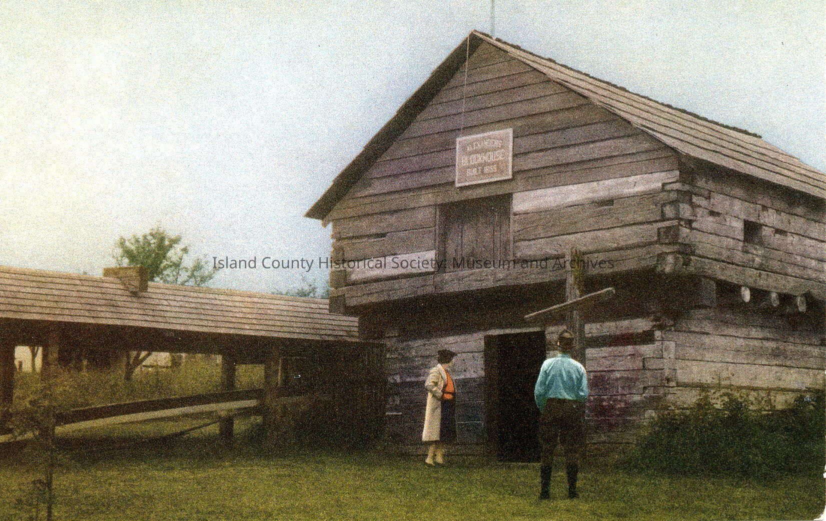 Postcard showing two people at Alexander blockhouse with cross and canoe shed with one canoe. On back - "No. 13 in UNION OIL COMPANY'S Natural Color Scenes of the West. RELIC of the historic international '54-40 or Fight' controversy, the Whidby Island Block House was built in 1855. This last British foothold in the United States is surrounded by Puget Sound, island region of Washington's great Northwest." Copyright 1940. Dark colors: gray, brown, and green.Made/Created