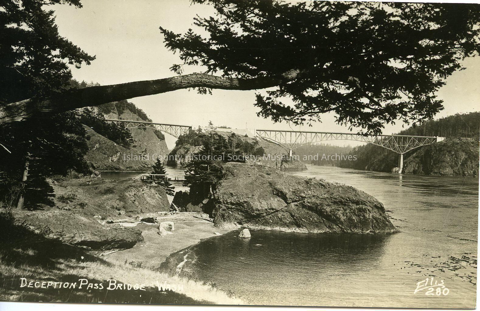 Black and white photo, view of canoe pass, view of Deception Pass, taken from rosario point, the bridge is approximately through the center of photo, tree at top of photo, left hand side of photo is made up of land, and island formation. On back of photo: In memory of: Sarah Jane Crosby Kelley, Born Oak Harbor 1896 - 1962, Emmaline Enid Crosby Huntley, Born Oak Harbor 1902 -1970, Parents; Frances George Crosby and Hannah Parker Crosby came to Oak Harbor 1894, the rockbound shores of Deception Pass are a part of the charm of Deception Pass State Park. This playground is easily accessible by highway and trail.
