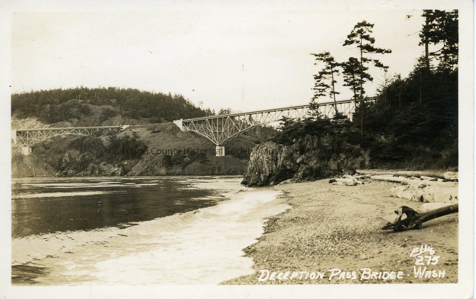 This black and white photograph shows a view of canoe pass and deception pass. On the beach there are logs. DOPS postcard issued 1925-1942.