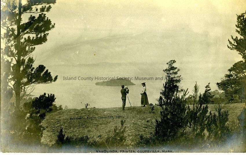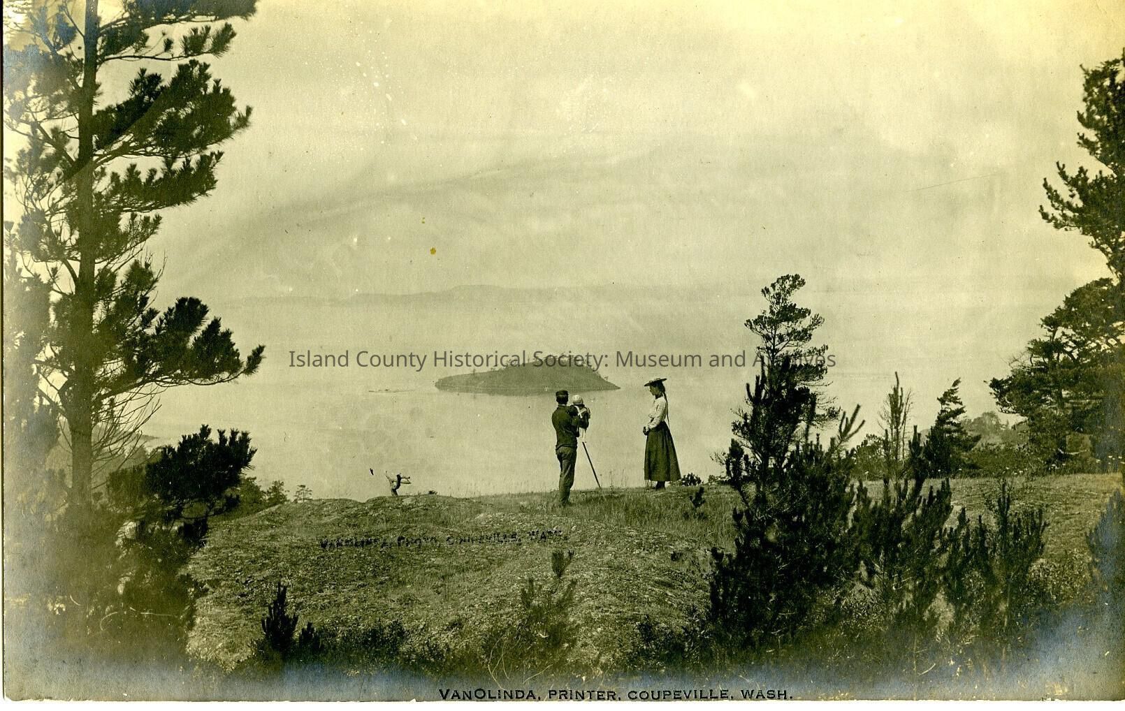 This black and white postcard shows a young man holding an infant standing alongside a young woman. They are both standing on a waterfront overlooking an island. The photo was taken behind several bushes, on the left is a tall tree, and on the right next to the woman is a smaller tree and several more bushes.