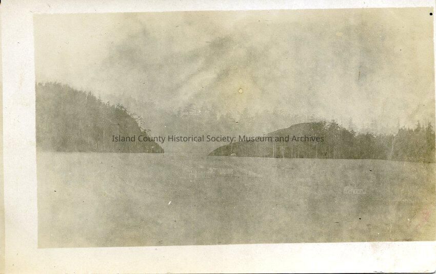 The black and white postcard shows a very grainy Deception Pass view. On the left of the photograph shows one silhouette of a landform with several trees sticking out at the top. The right side of the photograph shows another silhouette of a landform that is stretched out to the middle of the photo. Behind the two silhouettes are very faint trees.