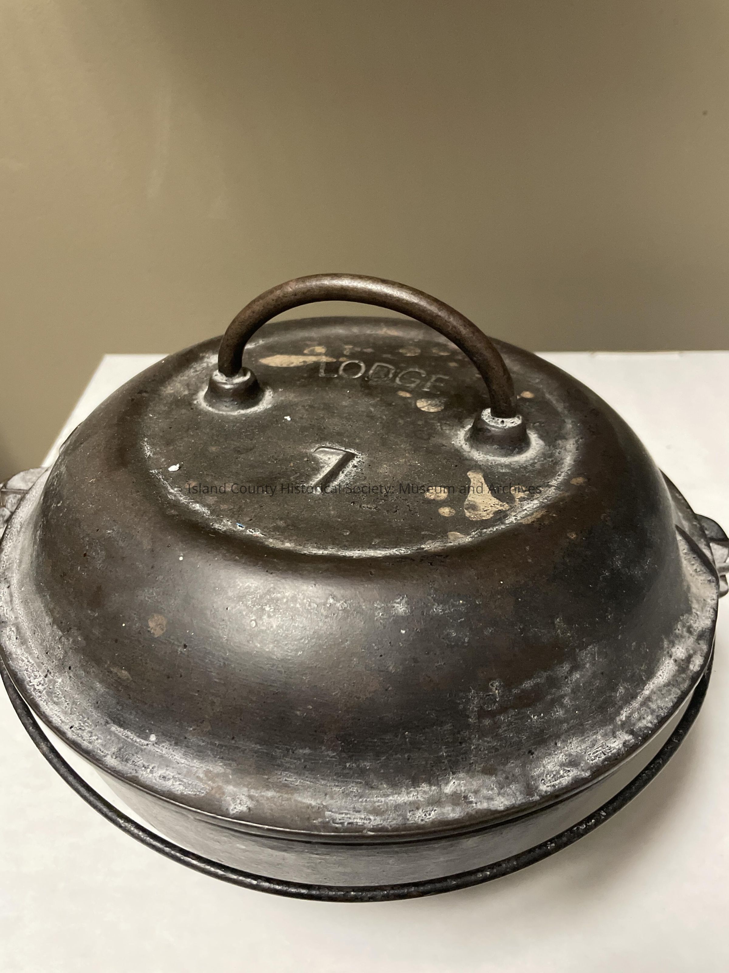 Small iron pot with handle for hanging in fireplace. LODGE 7 imprinted on side and USA imprinted on bottom of pot. Dutch oven.