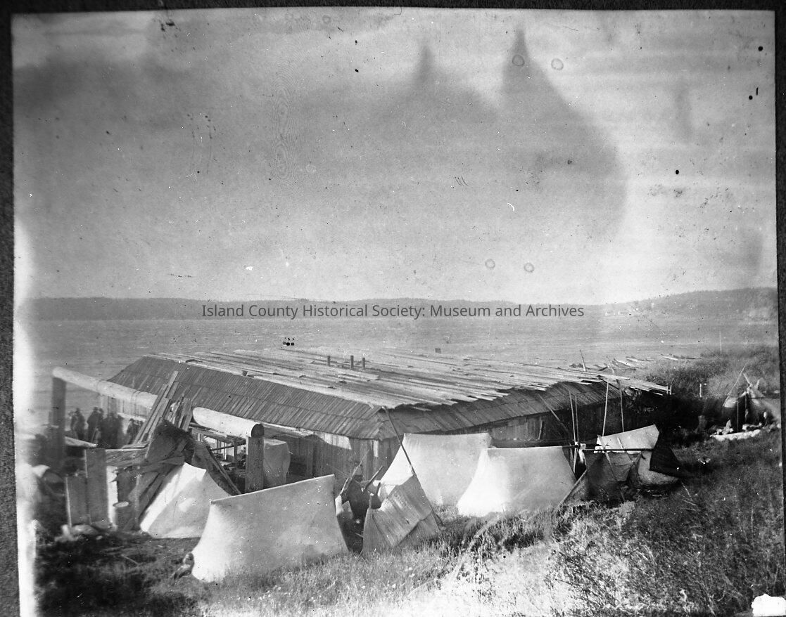 Potlatch house at monroe's landing, the potlatch house is surrounded by tents and is overlooking the beach.Made/Created