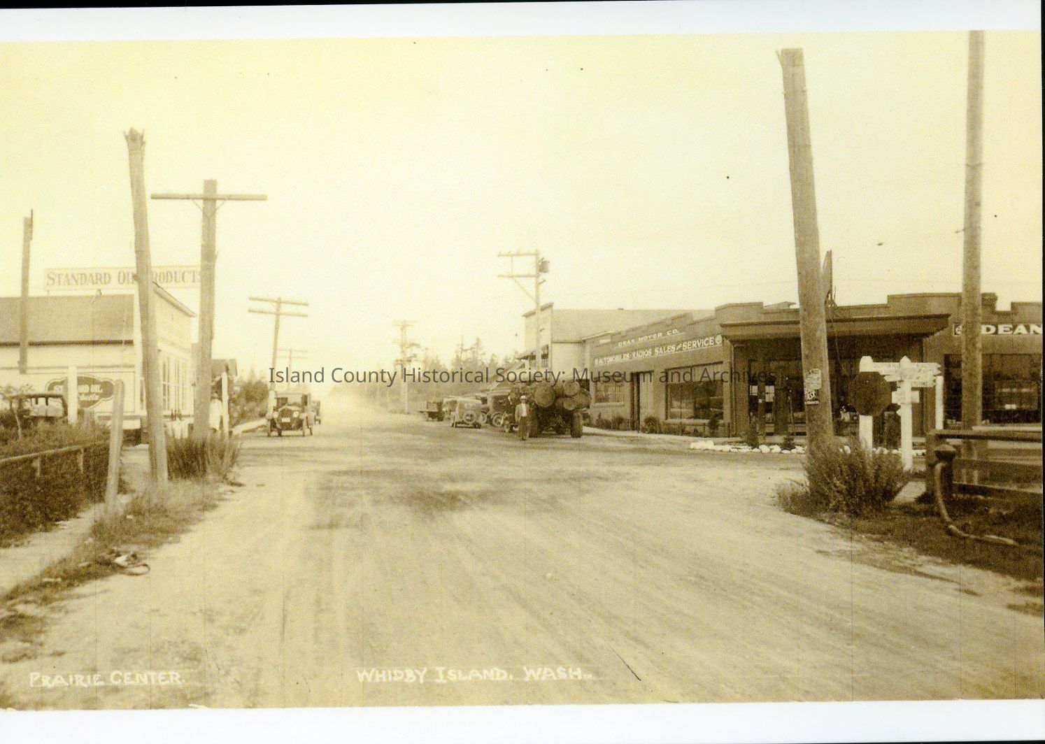 Photograph of "Prairie Center" in Coupeville, c. 1920s. The "Standard Oil Products" storefront can be seen in the far left of the photo; Dean Motor Co. can be seen on the right.Photograph Details