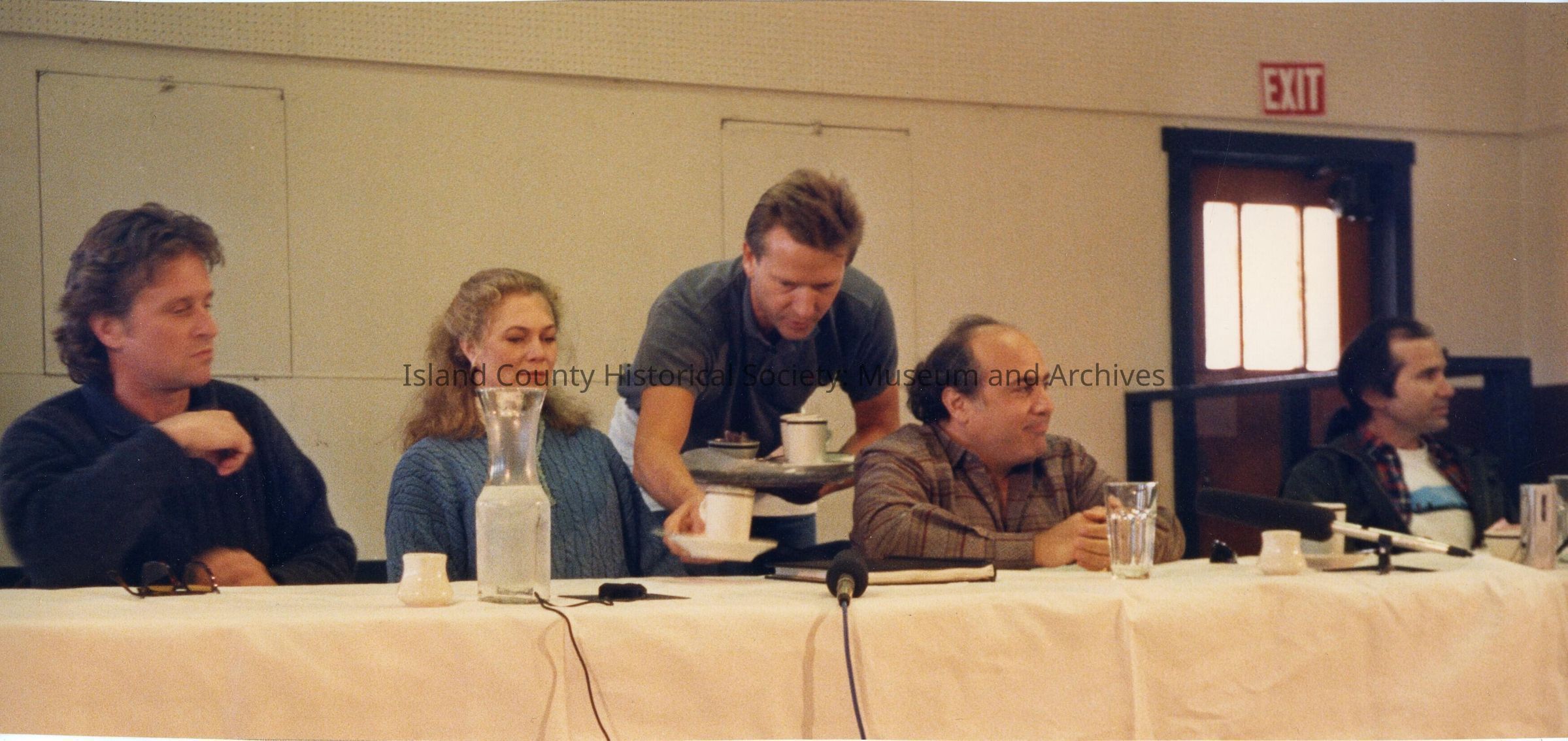 Photo of Michael Douglas, Kathleen Turner, Danny DeVito during the filming of "War of the Roses" in 1989. They are seated at a table during a press meeting. On the back: Michael Douglas, Kathleen Turner, Mike Auter, Danny DeVito, War of the Roses